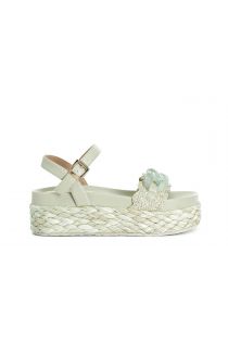 Colour block sandals in woven raffia with transparent satin chain accessory. comfortable footbed and raffia-clad wedge.