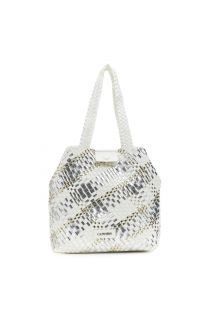 A contemporary woven shopping bag made of multicolored metallic material. spacious and versatile it features a front logo tag and a reversible interior for two looks in one perfect for daytime and leisure. dimensions: 38 cm (length) × 30 cm (height) × 14 cm (depth)