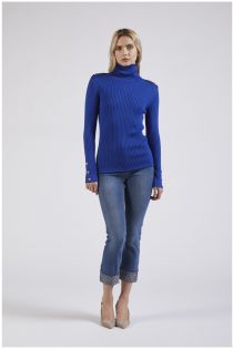 High-necked long-sleeved sweater made with viscose yarn rib knitting. personalised plates at the shoulders and logo buttons at the wrists.