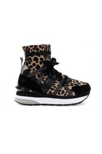 Running ankle boots in black stretch fabric or animal print. Fabric lining, leather insole, and 4 cm high sole. Comfort and style for a statement sneaker.