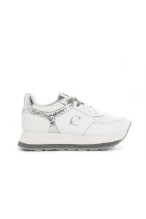 Women's sneakers with laced running sole. shoe in coated leather and fabric with shimmer effect inserts. side silver logo with cafènoir monogram. sole height 30 mm. internal footbed.