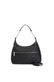 Hobo bag with all over logo quilting. single compartment and zipped inner pocket. large zipped pocket on the front of the bag. zip closure. shoulder strap with gold chain.