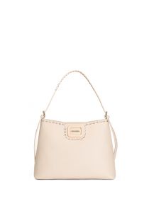 saffiano bag with enamelled accessory and metallic threading motif powder