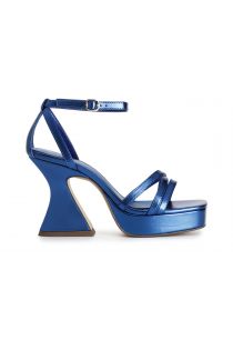 Patent-effect sandals with three bands and elastic at the back. ankle strap. 90mm-high reel heel and platform. comfortable shoe characterised by its square toe. simple wrap-around upper.