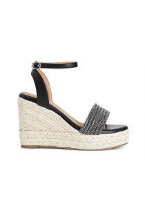 Sandals with mignons rhinestone decoration on the upper. 10.5 cm rope wedge and 3.5 cm platform. ankle strap. leather insole.