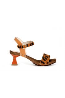 Sandals with spotted pony strap and matching hourglass heel. patent leather straps accompany the strap at the back