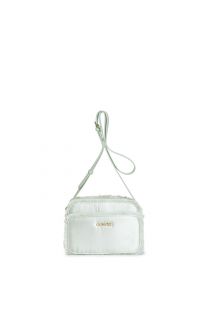 Satin camera bag with elegant fringes equipped with a front pocket and adjustable shoulder strap with buckle. perfect for a refined and practical style.