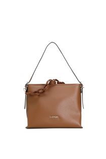 Semi-rigid boho bag with handle locked by metal buckles at the sides and enriched by a chain made of soft material.