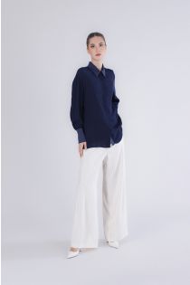 Women's viscose marocain shirt with long ruffled sleeves and refined satin trim. an elegant and flowing silhouette ideal for office looks and formal occasions. the model is 175 cm tall and wears size s. fit: regular.