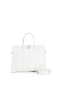 Rigid tote with draped workmanship. contrasting cafènoir logo. tubular handles. zip closure. bag with shoulder strap.