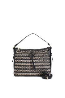 Woven mesh shoulder bag with hand-threaded cn logo and tie knot detail. equipped with removable shoulder strap and zip closure perfect for any occasion.