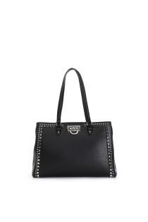 Shopping bag with a rigid structure with rivet applications and metal closure. bag divided into various compartments: a partition closed with a zip and a small pocket with a zip.