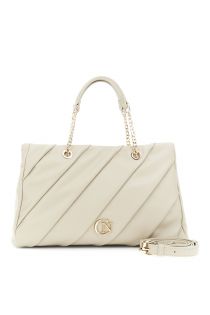 Faux leather shopping bag with front pleating, back zip pocket, and internal divider. Padded handles with metal Café Noir logo chain and removable shoulder strap.