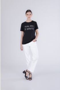 Stretch cotton jersey t-shirt with a regular fit and short sleeves. classic crew neck and "sun sea and spritz" lettering with crystal rhinestones for a bright trendy touch. the model is 171 cm tall and wears a size s. fit: regular.