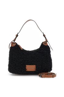Curly fabric shoulder bag with contrasting leather-effect details. Front plaque with threaded details and logo. Removable shoulder strap for dual carry.