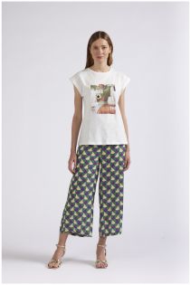 Sleeveless t-shirt in stretch cotton jersey. the rhinestone-embellished print depicts a bust of a woman wearing a cardigan and shorts.