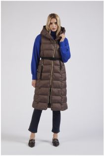 Padded quilted waistcoat with warm cosy hood. the stretch panel belt defines the waist.