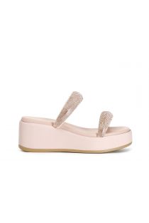 Slides with rhinestone-clad straps. a comfortable wide wedge with a padded insole clad with napa leather.