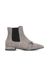 Slim shaped suede ankle boots with stretch bands and decorating bit.
