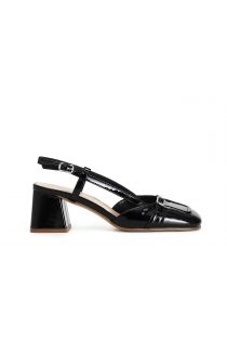 Patent leather open shoes with loafer effect border and jewelled buckle. rounded shoe shape. a mix between a loafer and a court shoe. lace at the back. 45mm-high heel. very comfortable perfect for everyday use.