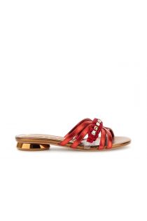 slipper-style sandals in laminated leather effect with rhinestone accents red