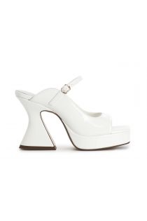 Patent leather-effect slipper with strap and buckle on instep and platform. 90 mm-high reel heel. a comfortable shoe characterised by its square toe. simple wrap-around upper.