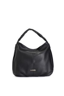 Soft boho bag with zip fastening rolled up handle and decorative tulip-shaped pendant.
