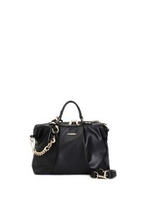 Soft bowling bag with central pleat and metal logo. flat handles. double shoulder strap either in two-tone chain or in the same material as the bag. zip closure.