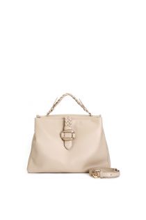 soft handbag with braided handle, buckle and removable shoulder strap. beige