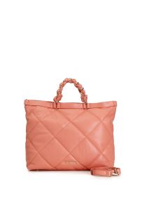 Shopping bag made of soft material with diamond quilting and chain handle with threading.