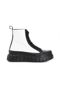 Sporty, lace-up ankle boots in quilted patent leather fabric. New elevated sole with a striped pattern. Warm faux fur lining.