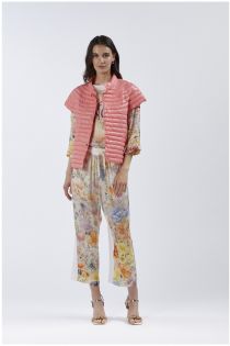 Spring down jacket with flap sleeves made of an impalpable nylon with a glossy finish. horizontal quilting button placket with logo snaps.