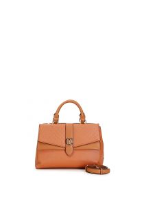 Stiff bowling bag in saffiano material with mock flap on the front panel embellished with micro studs and personalised with cafènoir charm which can be carried by hand or with a shoulder strap.