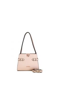 Stiff bandoleer bag made of saffiano-effect material with strap secured by metal loops and matching cafènoir accessory set in the edge of the front panel with optional shoulder strap.