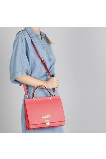 stiff saffiano-effect faux leather satchel with small wallet bag coral
