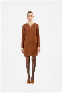 straight dress with "v" neckline in bi-stretch fabric tobacco