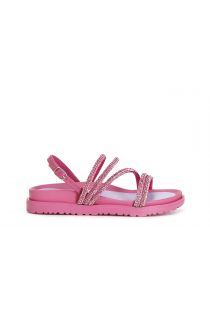 Asymmetric sandals with five rhinestone-clad straps leather insole on comfortable footbed.