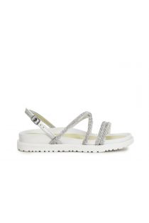 Asymmetric sandals with four rhinestone-clad straps leather insole on comfortable footbed.