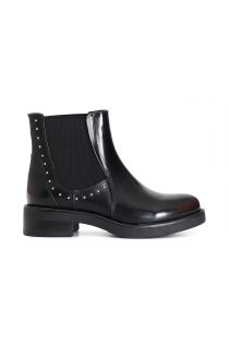 Women's brushed leatherette ankle boot with stretch panel on the side of the leg for an easy fit. all enhanced by chrome-plated micro studs. the insole is leather.