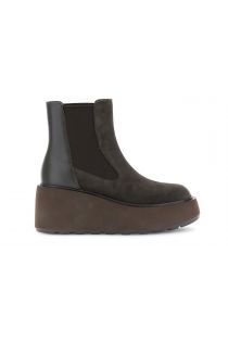 Women's suede ankle boots with smooth leather inserts. Elasticated design, 7.5 cm heel and 4 cm platform. Comfort and style for contemporary urban looks.