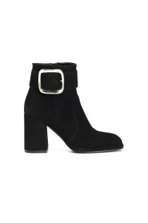 Women's suede ankle boot with large decorative buckle. zip on the inside of the upper makes it super easy to put on. 85mm squared heel: leather insole.