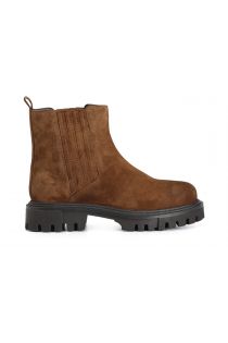 Women's suede ankle boot with concealed stretch panel. the heel is 35mm. leather insole. lug sole.