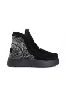 Suede ankle boots and micro rhinestones with faux fur lining. Metal logo and elevated sole. The trim is embellished with visible stitching.