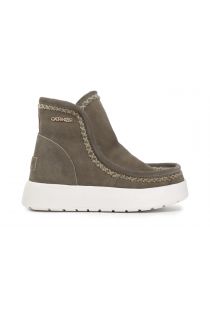 Suede ankle boots with faux fur lining. Metal logo and elevated sole. The trim is embellished with visible stitching.