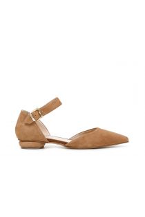 Suede ballet flats with tapered toe and ankle strap. Low heel covered with the same material as the upper