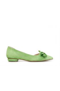 Asymmetrical suede ballet flats with a tapered toe. Low heel covered with the same material as the upper. A large bow decorates the toe that makes it very chic