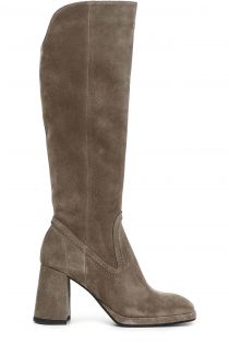 Suede boots with ornamental stitching, square shaped, medium high heel