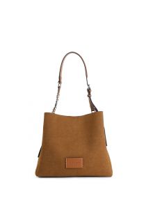 suede effect shoulder bag with large lettering on the shoulder strap tan