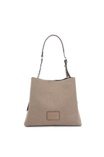 suede effect shoulder bag with large lettering on the shoulder strap taupe