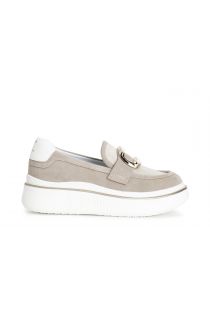 Two-tone women's moccasin in covered leather with 3 cm platform. shoe embellished with jewel clamp. round tip. internal footbed. 4.5 cm high sole. footwear that accompanies your days with comfort and fashion